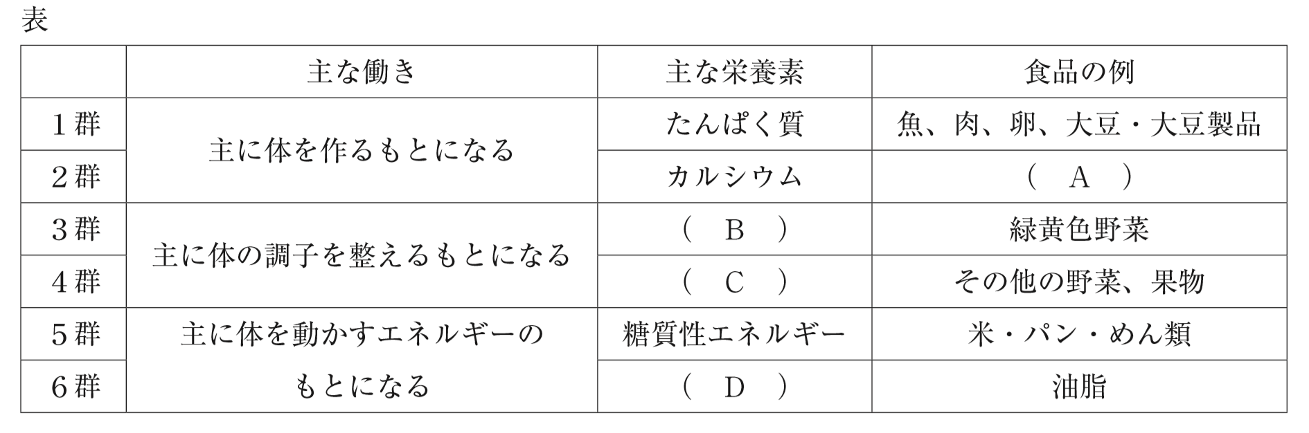 | 3 | A:牛乳・乳製品、海藻、小魚 B:カロテンC:ビタミンC D:脂肪性エネルギー |